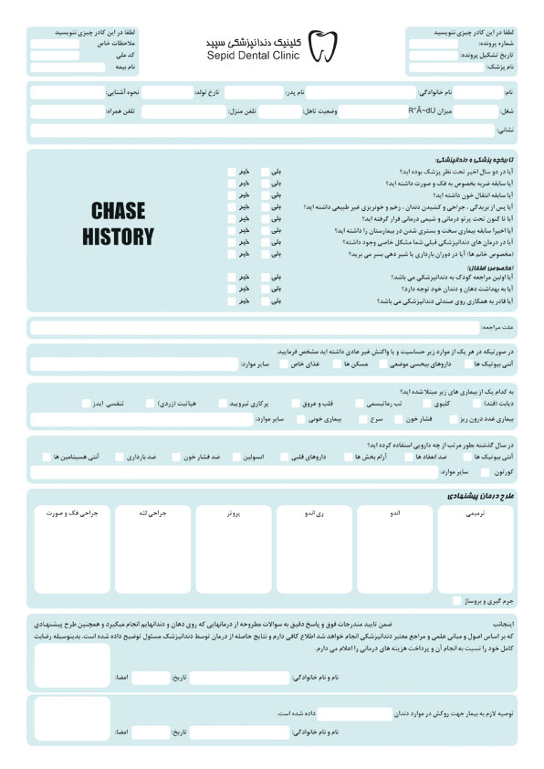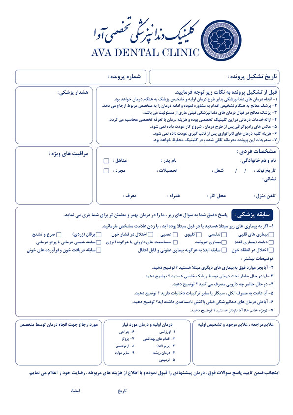 پرونده دندانپزشکی دورو قابل چاپ روی کاغذ یا مقوا