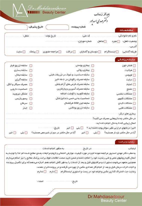 فرم رضایت نامه آگاهانه تزریقات زیبایی